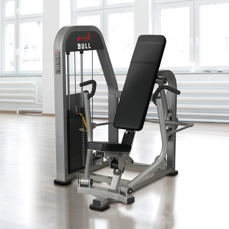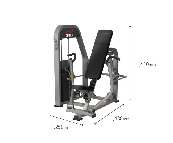 アームの軌道は大胸筋が理想的な最大収縮し易く設計。座面の高さは座った時に、足の裏が床を踏める高さを意識しました。