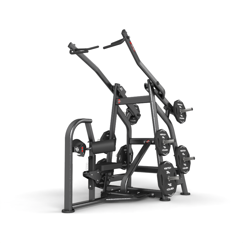 背中トレーニングの基本であるプルダウントレーニングをプレートローディング特有の刺激。