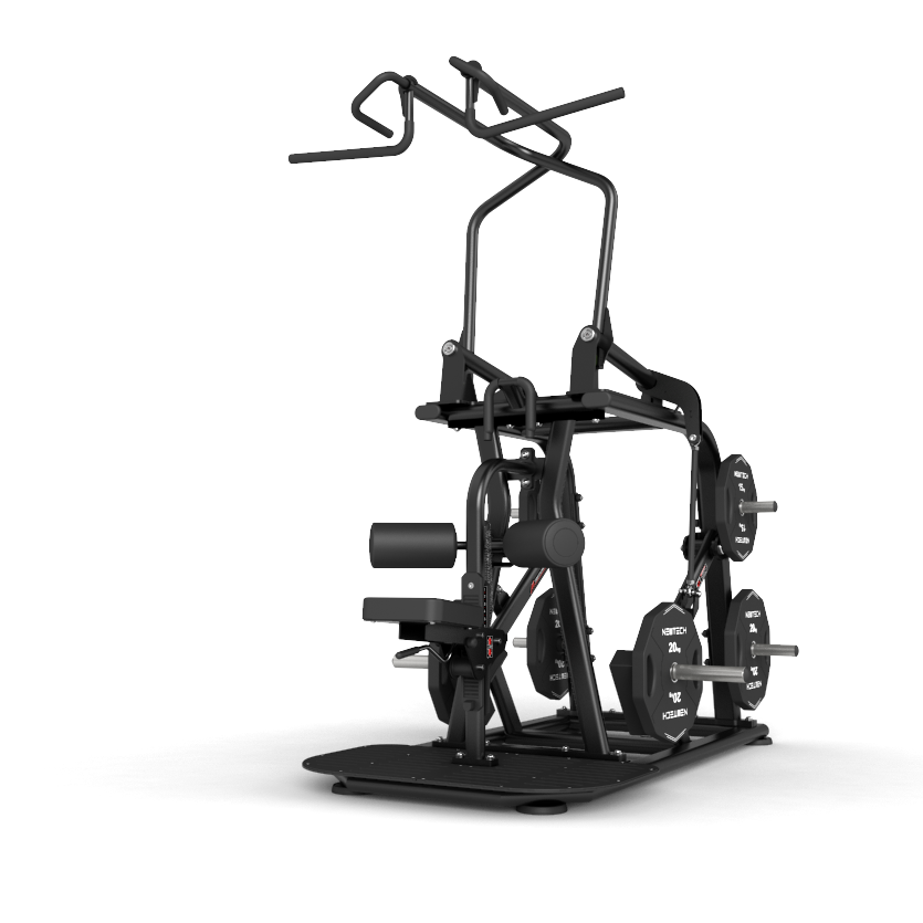 背中トレーニングの基本であるプルダウントレーニングをプレートローディング特有の刺激。